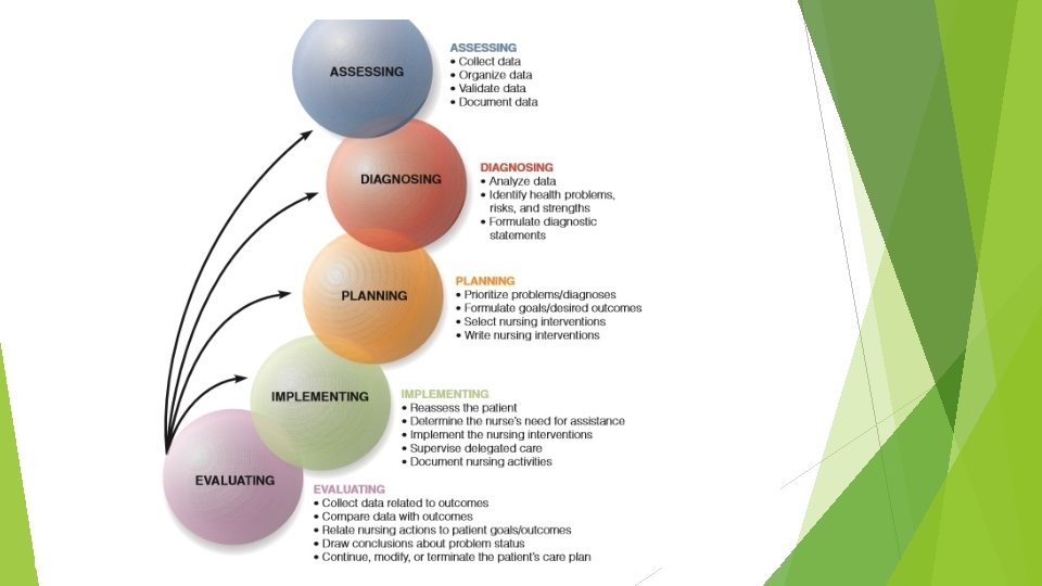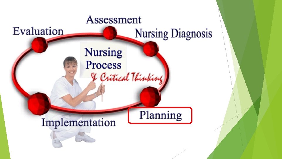 Overview of The Nursing Process The nursing process is a systematic method of problem solving that uses a nurse’s critical thinking skills to care for the patient. It is patient-centered, dynamic, and based on ongoing patient data and needs, and is a collaborative effort between the nurse, patient, and other members of the health care team. The nurse relies on knowledge, technical and critical thinking skills, and even creativity to work through the process of gathering assessment data, establishing nursing diagnoses, planning care with the patient to meet outcomes, implementing, and, finally, evaluating care. The nursing process is cyclical and each phase is related to all the others; they are not separate entities but overlap. For example, when a nurse is evaluating whether the pain medication given to the patient has had therapeutic effects and relieved the pain, the nurse relies on assessment skills to evaluate whether the patient is pain-free or has obtained some relief from the drug.