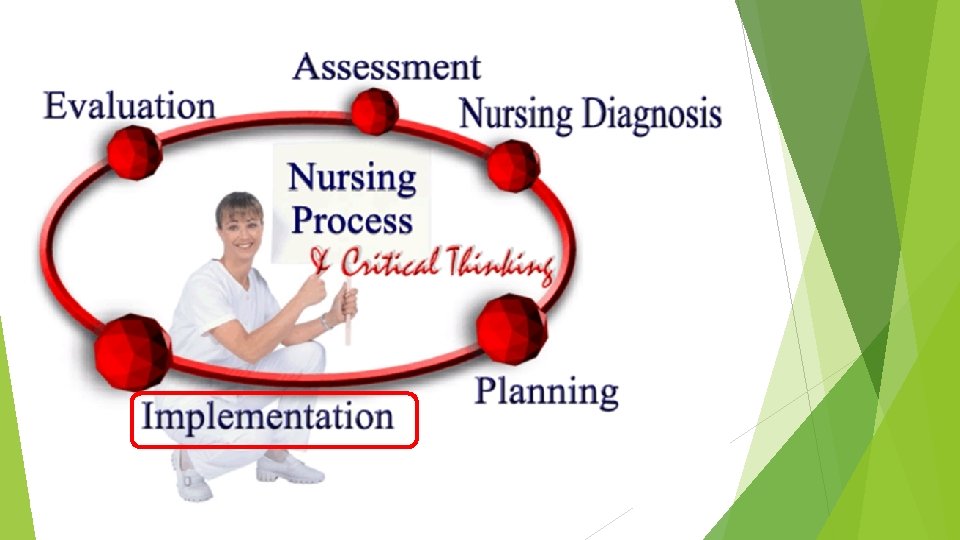 Key Concepts The implementation phase involves administering the drug and carrying out interventions to promote a therapeutic response and minimize adverse effects of the drug. The implementation phase is when the nurse applies the knowledge, skills, and principles of nursing care to help move the patient toward the desired goal and optimal wellness. Implementation involves action on the part of the nurse or patient: administering a drug, monitoring drug effects, providing patient teaching, and initiating other specific actions identified by the plan of care. Key interventions required of the nurse in the implementation phase include, documenting medications.