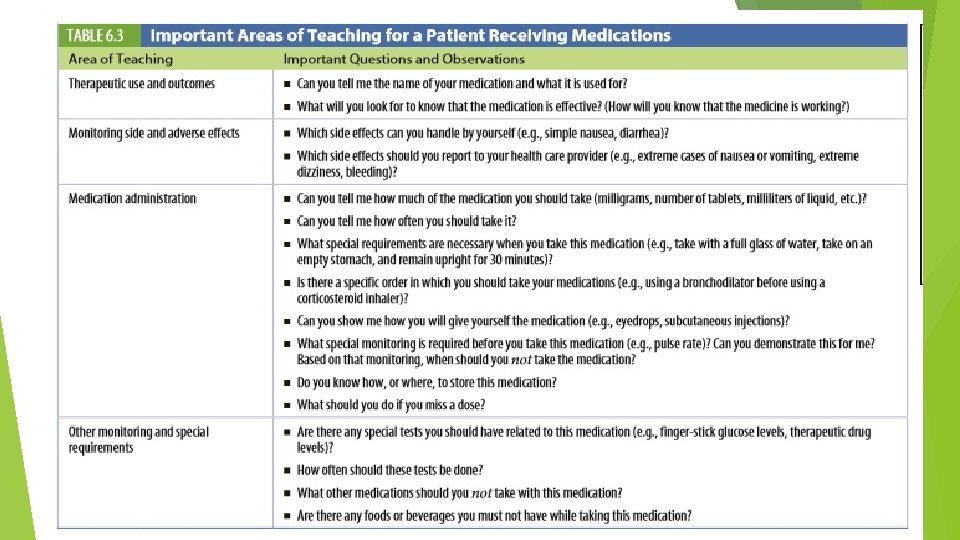 Patient Education Patient teaching is a vital component of the nurse’s interventions for a patient receiving medications. Knowledge deficit are directly related to the type and quality of medication education that a patient receives. Every nurse–patient interaction can present an opportunity for teaching. Discussing medications each time they are administered is an effective way to increase the amount of education accomplished.