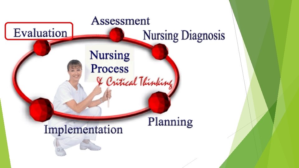 Key Concepts The evaluation phase of the nursing process compares the patient’s current health status with the desired outcome. This step is important to determine if the plan of care is appropriate, if it was met, or if it needs revision. Nursing diagnoses are reviewed or rewritten, goals and outcomes are refined, and new interventions are carried out. If it was met, the plan of care was appropriate, and the problem or risk was resolved. The nurse and patients can then address the next highest priority health need. If the goal was partially met, the patient is moving toward the goal, but the nurse may need to continue interventions for a longer time, or somehow modify interventions to completely resolve the problem.