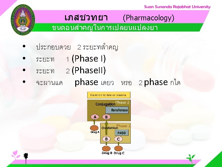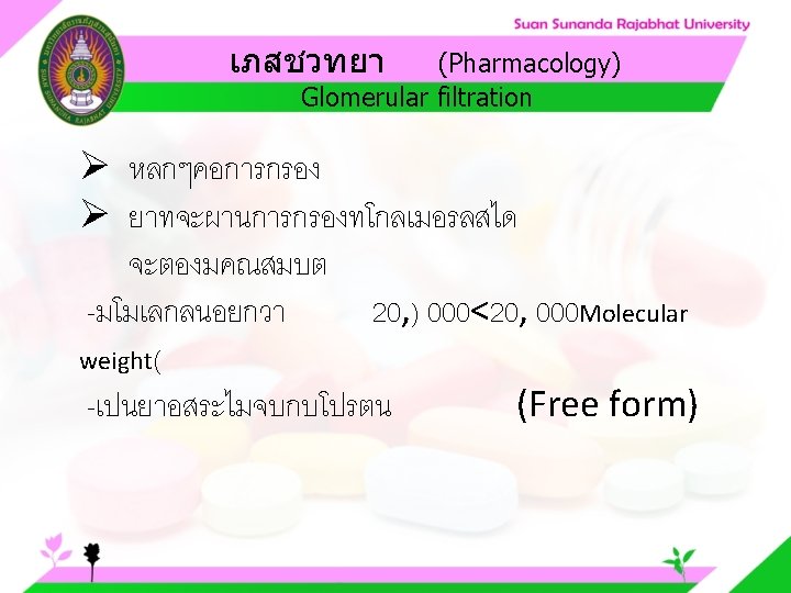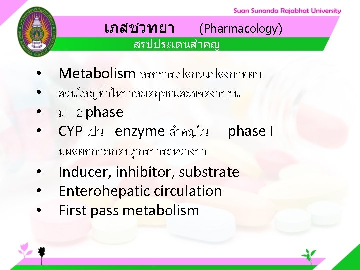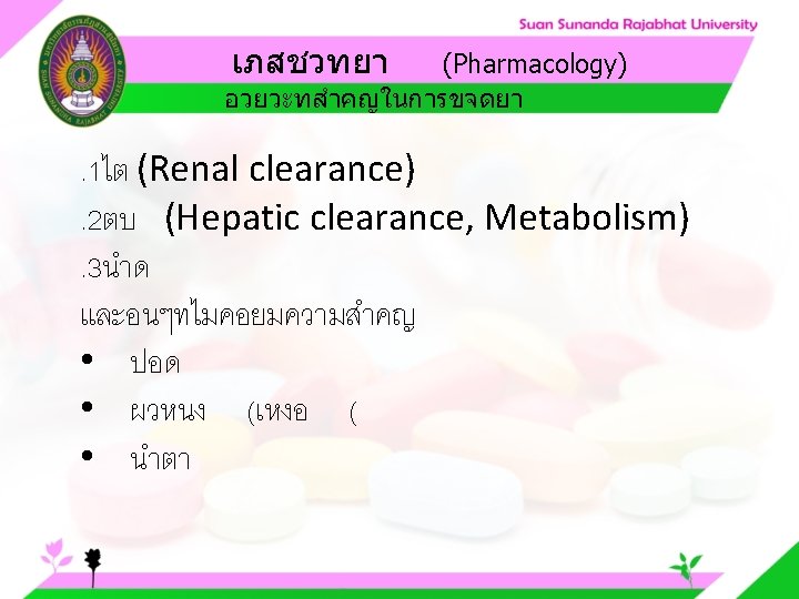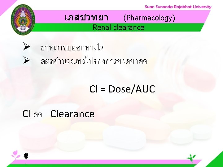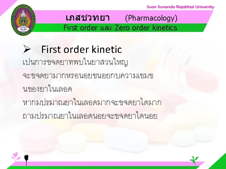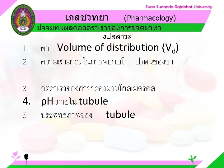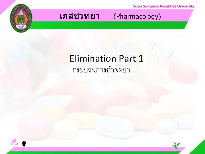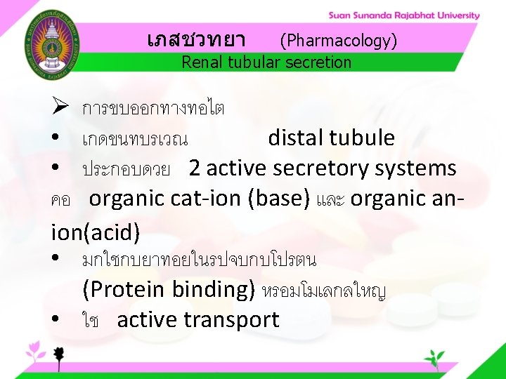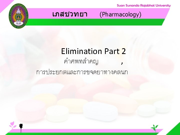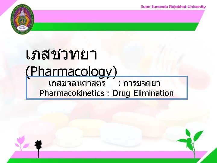 Pharmacology Cytochrome P 450 system Pharmacology CYP Inducer Slides: 57 Download presentation เภสชวทยา (Pharmacology) Cytochrome P 450 system เภสชวทยา (Pharmacology) ความสำคญของ CYP Inducer ออกฤทธ Enzyme Substrate Inhibitor Enzyme ออกฤทธ เภสชวทยา (Pharmacology) การขจดยา (Drug elimination) เภสชวทยา (Pharmacology) ไต (Kidney) เภสชวทยา (Pharmacology) Glomerular filtration เภสชวทยา (Pharmacology) Glomerular filtration เภสชวทยา (Pharmacology) Renal tubular secretion เภสชวทยา (Pharmacology) Renal tubular secretion Organic anion transport Organic cation transport (Acid) (Base) Indomethacin Dopamine Penicillin G Morphine Probenecid Quinine Aspirin Amiloride Phenylbutazone Cimetidine เภสชวทยา (Pharmacology) การขจดยาทางไต 1. Small, nonprotein bound 3. Large, protein bound, acid and base 4. Aqueous soluble, ionized drugs 2. Lipid soluble, unionized drugs เภสชวทยา คาครงชวต 4 x daily 50 mg 2 x daily 100 mg 1 x daily 200 mg (Pharmacology) (Half Life) เภสชวทยา (Pharmacology) First order kinetics graph เภสชวทยา (Pharmacology) Zero order kinetics graph