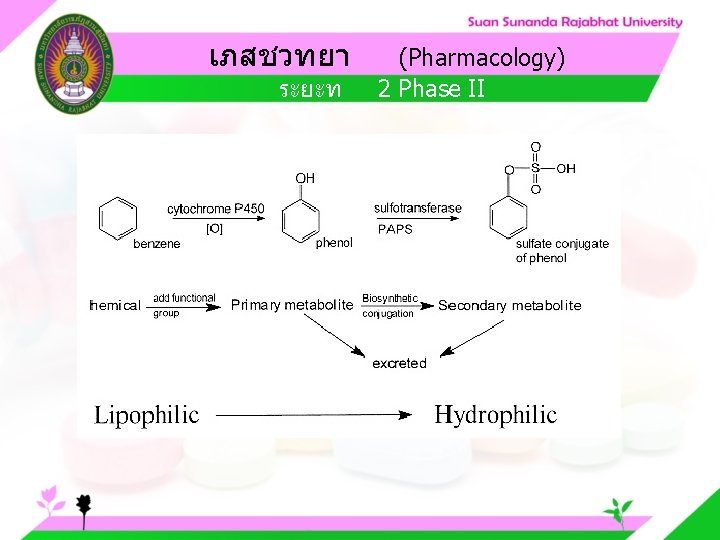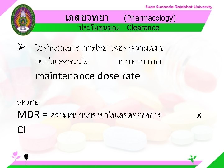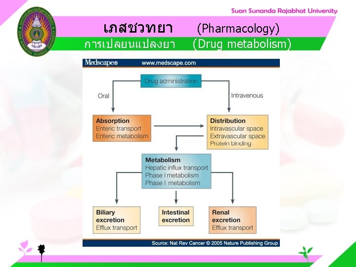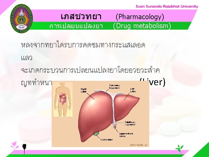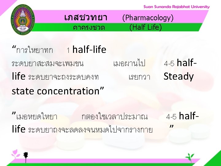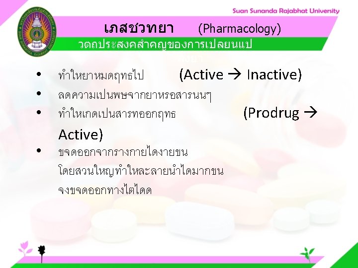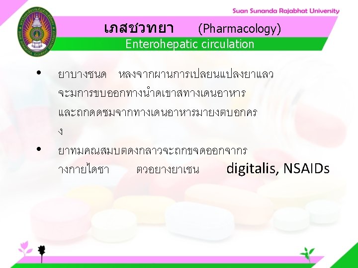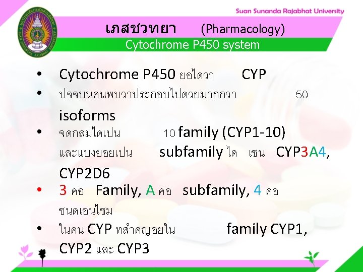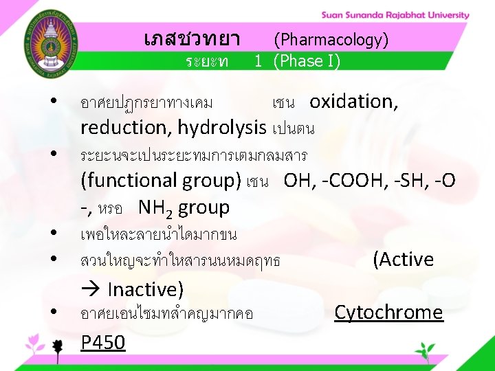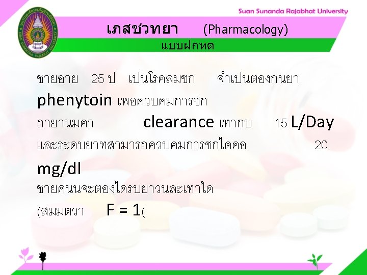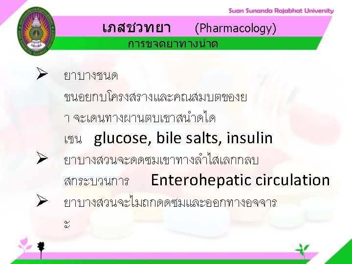 Pharmacology Cytochrome P 450 system Pharmacology CYP Inducer Slides: 57 Download presentation เภสชวทยา (Pharmacology) Cytochrome P 450 system เภสชวทยา (Pharmacology) ความสำคญของ CYP Inducer ออกฤทธ Enzyme Substrate Inhibitor Enzyme ออกฤทธ เภสชวทยา (Pharmacology) การขจดยา (Drug elimination) เภสชวทยา (Pharmacology) ไต (Kidney) เภสชวทยา (Pharmacology) Glomerular filtration เภสชวทยา (Pharmacology) Glomerular filtration เภสชวทยา (Pharmacology) Renal tubular secretion เภสชวทยา (Pharmacology) Renal tubular secretion Organic anion transport Organic cation transport (Acid) (Base) Indomethacin Dopamine Penicillin G Morphine Probenecid Quinine Aspirin Amiloride Phenylbutazone Cimetidine เภสชวทยา (Pharmacology) การขจดยาทางไต 1. Small, nonprotein bound 3. Large, protein bound, acid and base 4. Aqueous soluble, ionized drugs 2. Lipid soluble, unionized drugs เภสชวทยา คาครงชวต 4 x daily 50 mg 2 x daily 100 mg 1 x daily 200 mg (Pharmacology) (Half Life) เภสชวทยา (Pharmacology) First order kinetics graph เภสชวทยา (Pharmacology) Zero order kinetics graph