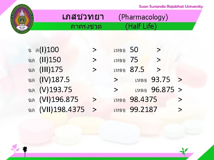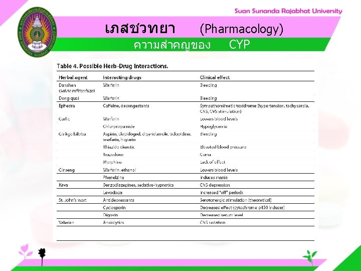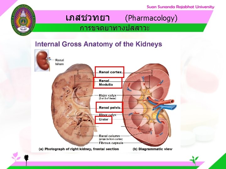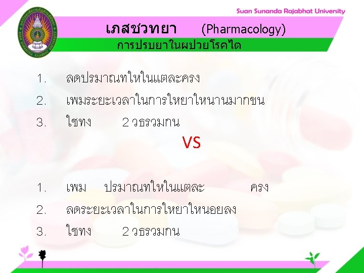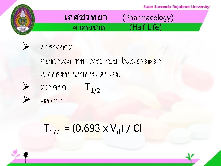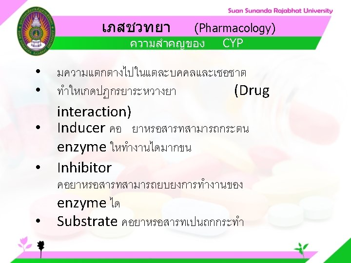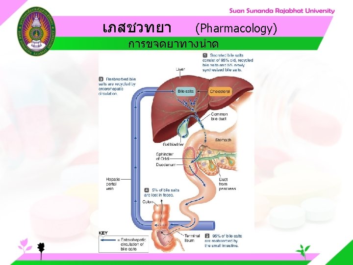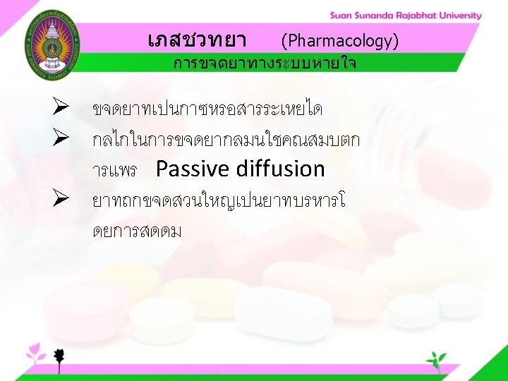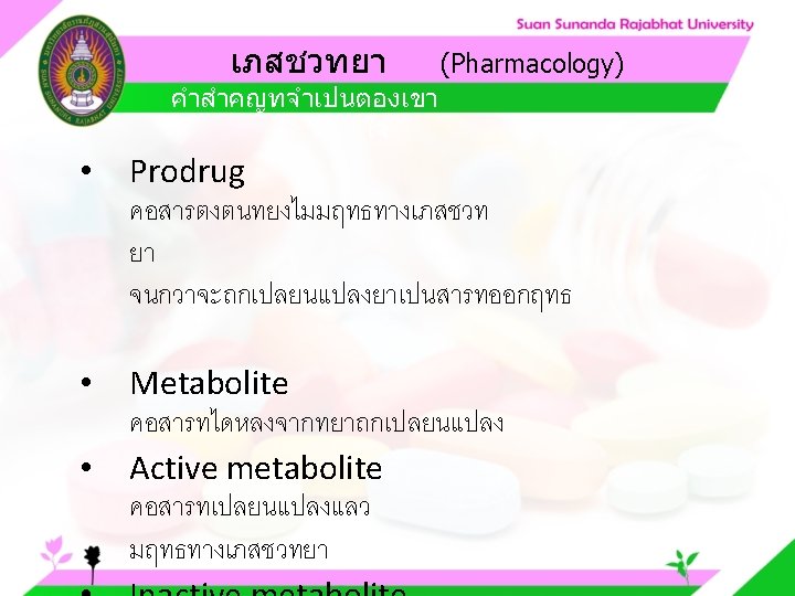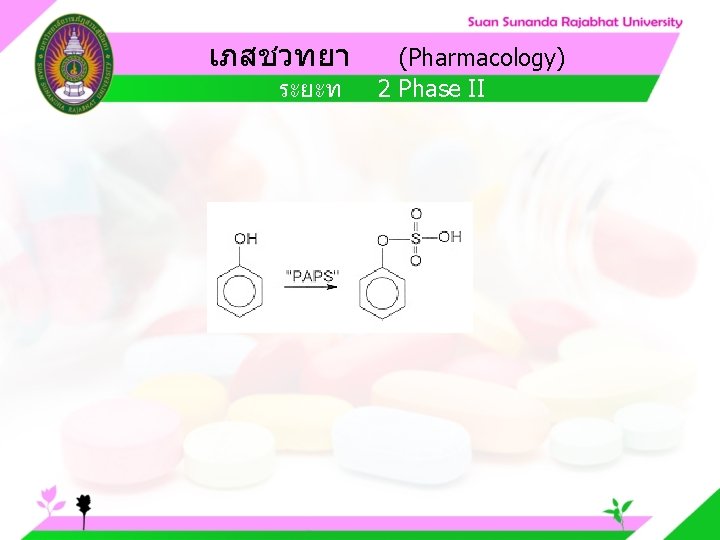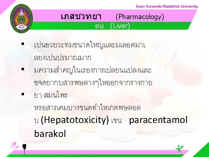 Pharmacology Cytochrome P 450 system Pharmacology CYP Inducer Slides: 57 Download presentation เภสชวทยา (Pharmacology) Cytochrome P 450 system เภสชวทยา (Pharmacology) ความสำคญของ CYP Inducer ออกฤทธ Enzyme Substrate Inhibitor Enzyme ออกฤทธ เภสชวทยา (Pharmacology) การขจดยา (Drug elimination) เภสชวทยา (Pharmacology) ไต (Kidney) เภสชวทยา (Pharmacology) Glomerular filtration เภสชวทยา (Pharmacology) Glomerular filtration เภสชวทยา (Pharmacology) Renal tubular secretion เภสชวทยา (Pharmacology) Renal tubular secretion Organic anion transport Organic cation transport (Acid) (Base) Indomethacin Dopamine Penicillin G Morphine Probenecid Quinine Aspirin Amiloride Phenylbutazone Cimetidine เภสชวทยา (Pharmacology) การขจดยาทางไต 1. Small, nonprotein bound 3. Large, protein bound, acid and base 4. Aqueous soluble, ionized drugs 2. Lipid soluble, unionized drugs เภสชวทยา คาครงชวต 4 x daily 50 mg 2 x daily 100 mg 1 x daily 200 mg (Pharmacology) (Half Life) เภสชวทยา (Pharmacology) First order kinetics graph เภสชวทยา (Pharmacology) Zero order kinetics graph