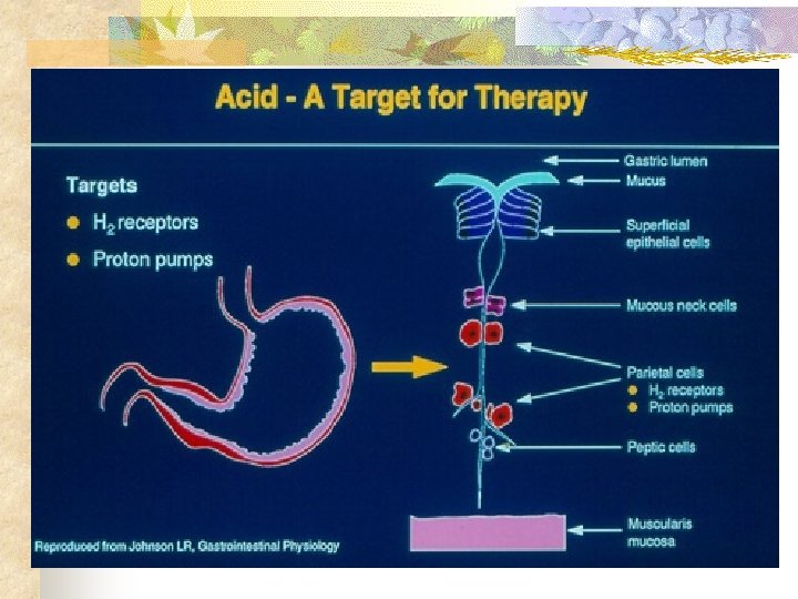 Defensive factors n n n Prevent the stomach and duodenum from being harmed (self-digestion). Mucus – continually secreted, protective effect Bicarb – secreted from endothelial cells, neutralized hydrogen ions Blood flow – good blood flow helps to maintain mucosal integrity Prostaglandins – stimulate secretion of bicarb and mucus and help promote blood flow, suppress secretion of gastric acid