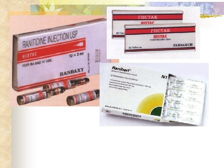 Histamine 2 -receptor antagonists n n Suppress secretion of gastric acid (activation of H 2 receptors promotes secretion of gastric acid) Cimetidine - first available, oral, IV, IM May take up to twelve weeks for ulcer to be healed Therapeutic uses – ulcers, GERD, Zollingerellison syndrome, aspiration pneumonitis, heartburn, indigestion