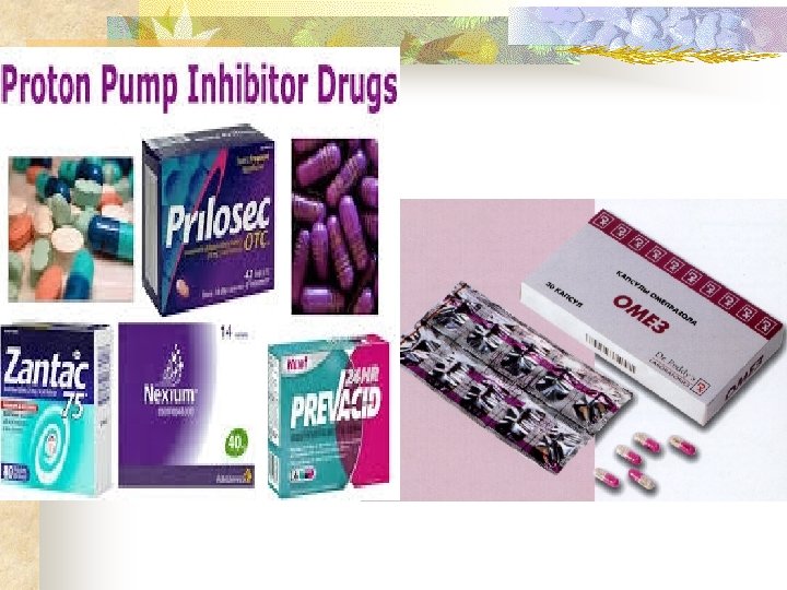 Proton Pump Inhibitors n n Suppress secretion of gastric acid Omeprazole – prilosec – prodrug that converts to active form in parietal cells of stomach – inhibits enzyme that generates gastric acid Ulcers, GERD, Zollinger-Ellison syndrome May contribute to development of gastric tumors?