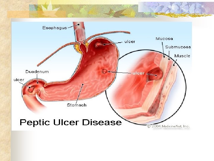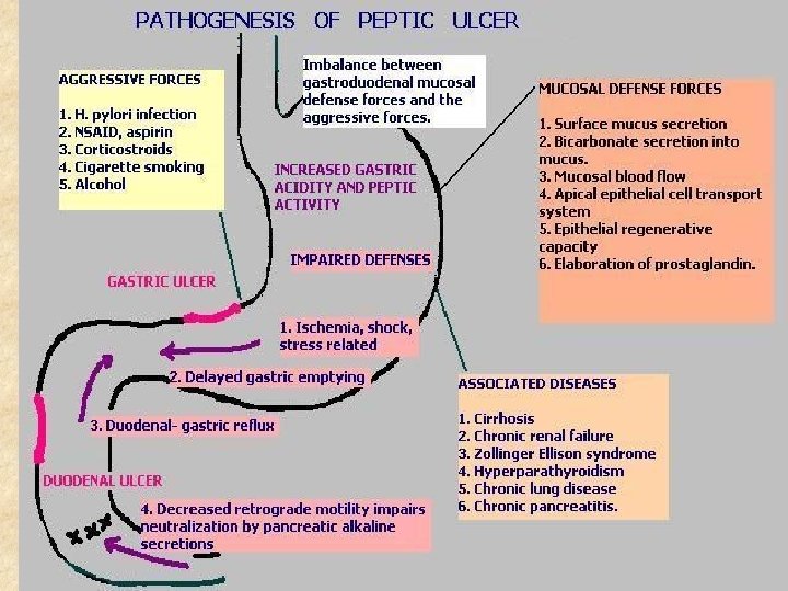 Peptic Ulcer Disease n n n Imbalance between mucosal defensive factors and aggressive factors Major defensive – mucus and bicarbonate Major aggressive – gastric acid, H. pylori, nonsteroidal anti-inflammatory drugs, pepsin