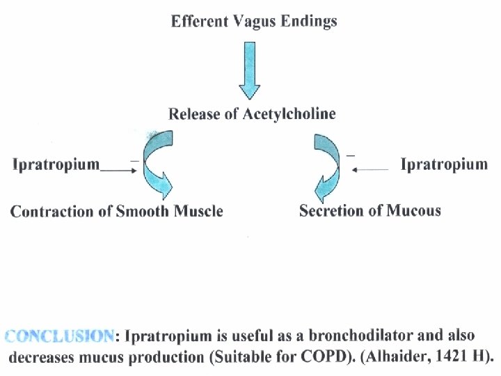 Muscarinic antagonists Ipratropium – Tiotropium Ø Act by blocking muscarinic receptors. Ø Given by aerosol inhalation Ø Quaternary derivatives of atropine therefore, Does not diffuse into the blood and do not enter CNS, minimal systemic side effects. Ø Delayed onset of action Ø Ipratropium has short duration of action 3 -5 hr Ø Tiotropium has longer duration of action (24 h).