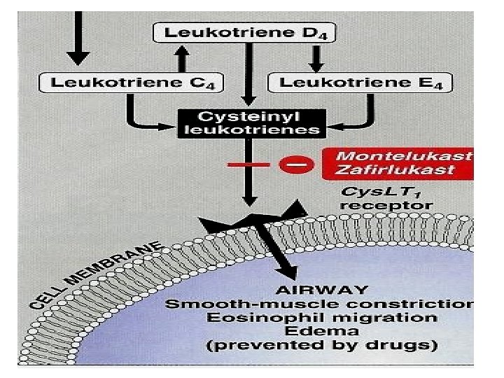 Leukotrienes antagonists Leukotrienes Ø produced by the action of 5 -lipoxygenase on arachidonic acid. Ø Synthesized by inflammatory cells found in the airways (eosinophils, macrophages, mast cells). Ø Leukotriene B 4: chemotaxis of neutrophils Ø Cysteinyl leukotrienes C 4, D 4 & E 4: – bronchoconstriction – increase bronchial hyper-reactivity – mucosal edema, mucus hyper-secretion