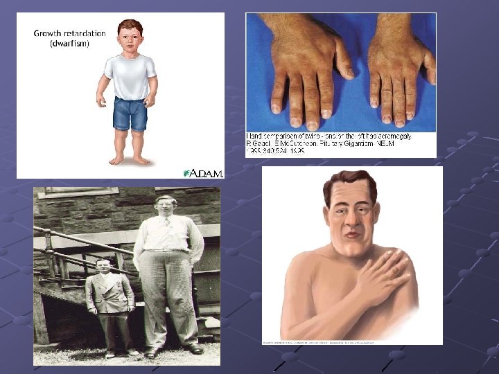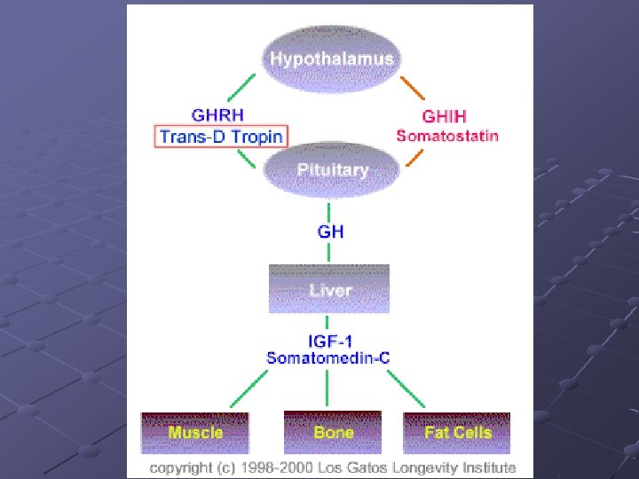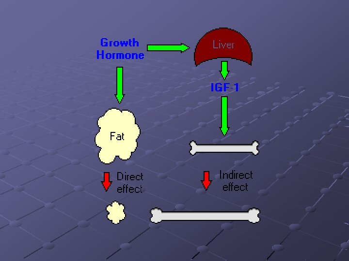 Indirect Effects of GH Stimulates: n n Cartilage cells (chrondrocytes) growth Myoblasts growth and differentiation Amino Acid uptake Protein synthesis