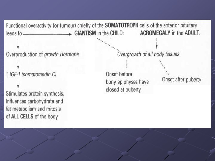 Deficiency or absence of somatotroph cells Underproduction of growth hormone (somatotrophin) PITUITARY DWARF (Lorain Dwarf) Delayed skeletal growth and retarded sexual development but alert, intelligent, well proportioned child.