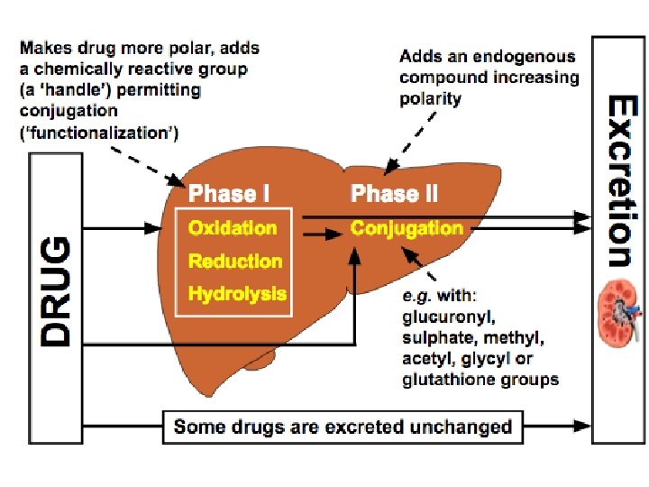 3. Metabolism Definition • Process of elimination, mainly through hepatic, renal and biliary routes Rates • First Order: catalysed by enzymes, rate of metabolism directly proportional to drug concentration • Zero Order: enzymes saturated by high drug doses, rate of metabolism is constant, e. g. ethanol, phenytoin Phase • 1 = polarise lipophilic drugs, reduction / oxidation / hydrolysis, catalysed by cytochrome P 450 system • 2 = conjugation, e. g. glucuronic acid, polarisation of drugs to be excreted by renal or biliary systems