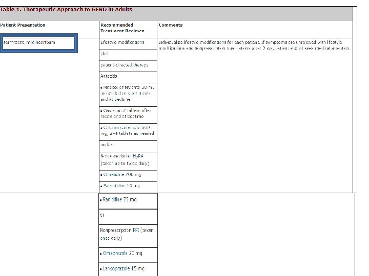 Pharmacologic therapies Initial treatment will depend on severity, frequency, and duration of symptoms. Strategies “Step-down” treatment “Step-up” treatment Starting with maximal therapy, such as therapeutic doses of PPIs, is always appropriate as a first-line strategy in patients with documented esophageal erosion Starting with lower-dose OTC products. Advantages: Rapid symptom relief, avoidance of overinvestigation. Advantages: Avoids overtreatment, has lower initial drug cost. Disadvantages: Potential overtreatment, higher drug cost, increased potential of adverse effects Disadvantages: Potential undertreatment (partial symptom relief), may take longer for symptom control, may lead to overinvestigation