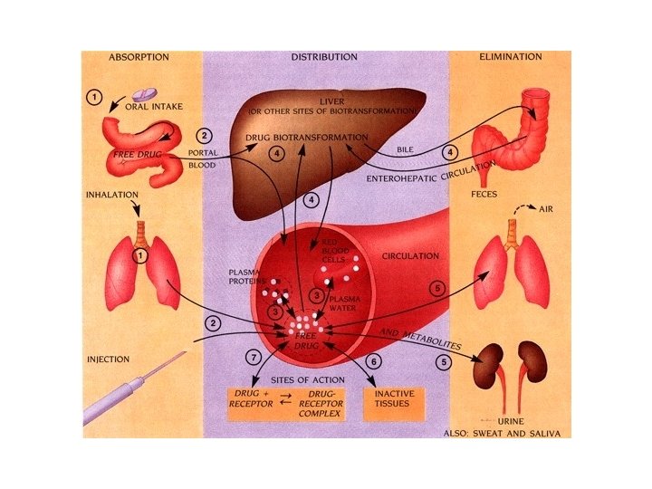 Pharmacokinetic Principles absorption plasma protein binding biotransformation free drug in circulation tissue storage (fat, muscle, bone) target site availability elimination