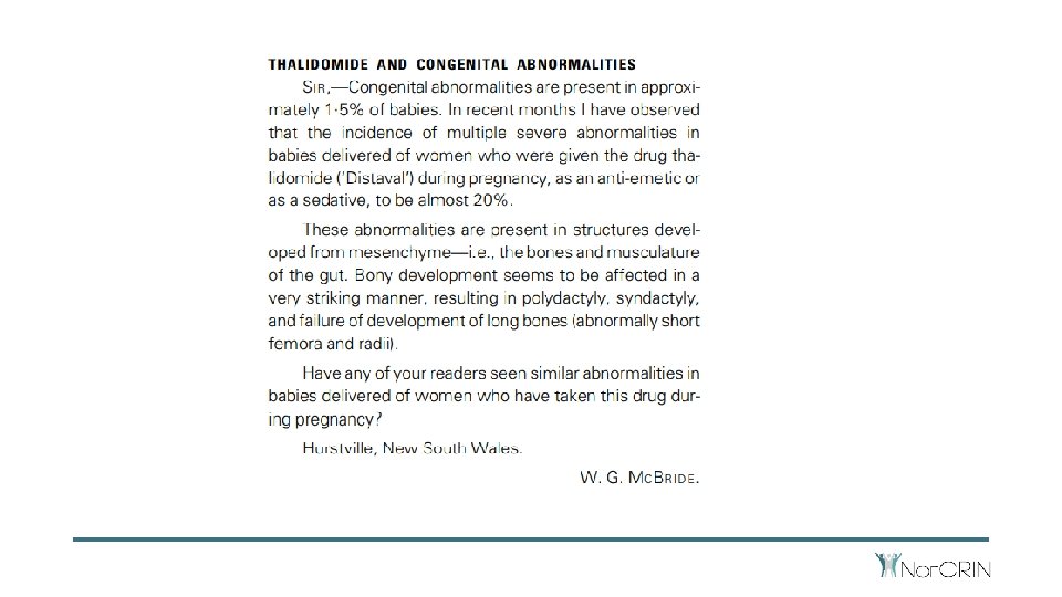 Thalidomide case • In the late 50’s thalidomide was sold as OTC medication to treat several conditions, including morning sickness in pregnant women • In 1961 Dr. Mc. Bride, Australian obstetrician and Dr. Lenz, German paediatrician, reported about birth defects/malformations Mc. Bride W. 1961. Thalidomide and congenital malformations. Lancet 1: 358 Lenz W. 1962. Thalidomide and congenital abnormalities. Lancet 1: 271– 272