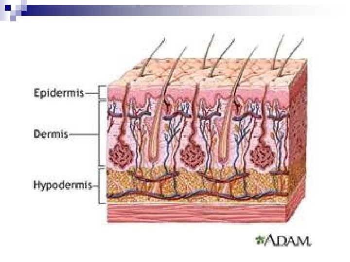 Skin anatomy and physiology n The skin is made up of three layers: ¨ Epidermis: (the most superficial layer that contains cells but not blood vessels ¨ Dermis: middle layer that is composed of blood and lymph tissues, nerve tissues, and accessory organs of skin such as glands and hair follicles ¨ Subcutaneous: deepest layer that is composed of connective tissue