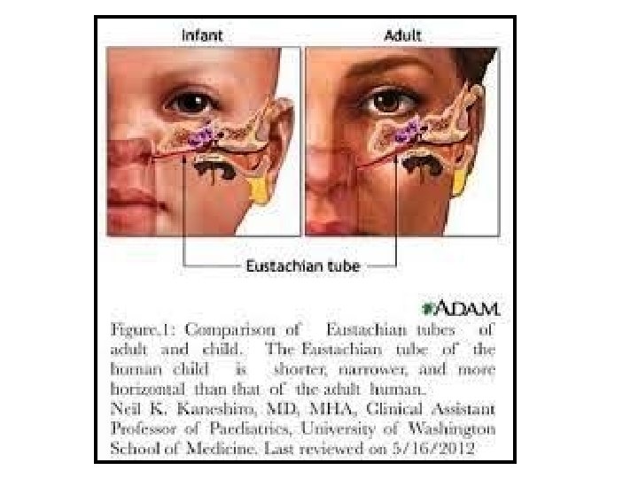 Differences between the Eustachian Tube of an Infant and an Adult Parameter Infant Adult Length 18 mm 36 mm Direction More or less horizontal Oblique, directed (makes an angle of 10° with downwards, forwards and horizontal plane medially fro tympanic end (makes an angle of 45° with horizontal plane Angulation of Isthmus No angulation Angulation present Applied Aspects v. Middle ear infections are more common in infants and young children than in adults, since the eustachian tube is shorter, wider and more horizontal and infections from nasopharynx can easily reach the middle ear.