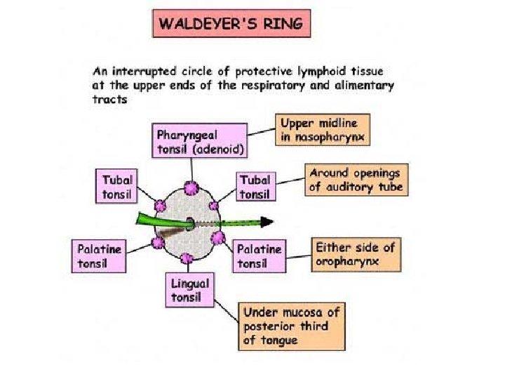 Adenotonsillar disease • Adenoids : – They develop from a subepithelial infiltration of lymphocytes in the 16 th week of gestation. – One component of the waldeyer ring. – present at birth and then begin to enlarge. They, along with the tonsils, continue to grow until individuals are aged 5 -7 years. – The adenoids can become infected and harbor pathogenic bacteria, which may lead to the development of disease of the ears, nose, and sinuses.