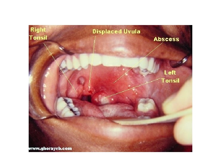 Clinical features • • • Fever, dehydration. severe dysphagia Edema of soft palate Uvular deviation (downward and medially) Involvement of motor branch of CN V increased salivation and trismus (Persistent contraction of the masseter muscles due to failure of central inhibition) • Hot potato voice • Unilateral referred otalgia