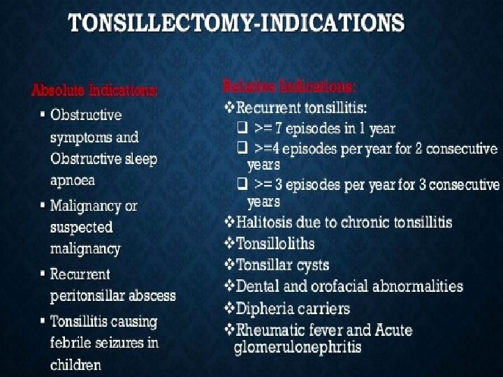 • Complications of adenotonsillectomy Postoperative hemorrhage: 0. 5– 10 % °Postoperative pulmonary edema: due to loss of auto-PEEP from chronic obstruction and • VPI (velopharyngeal insufficiency ) • Nasopharyngeal stenosis • Atlantoaxial subluxation (Grisel’s syndrome ) laxity of anterior transverse ligament; Down syndrome children more prone to this Diagnosis: MRI or CT C-spine Treatment: muscle relaxants, benzodiazepines, spine consultation/traction, cervical collar, NSAIDs • Malodorous breath (most common complaint) • •