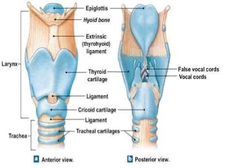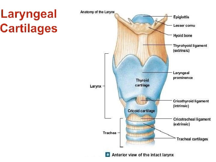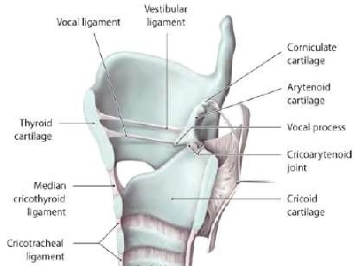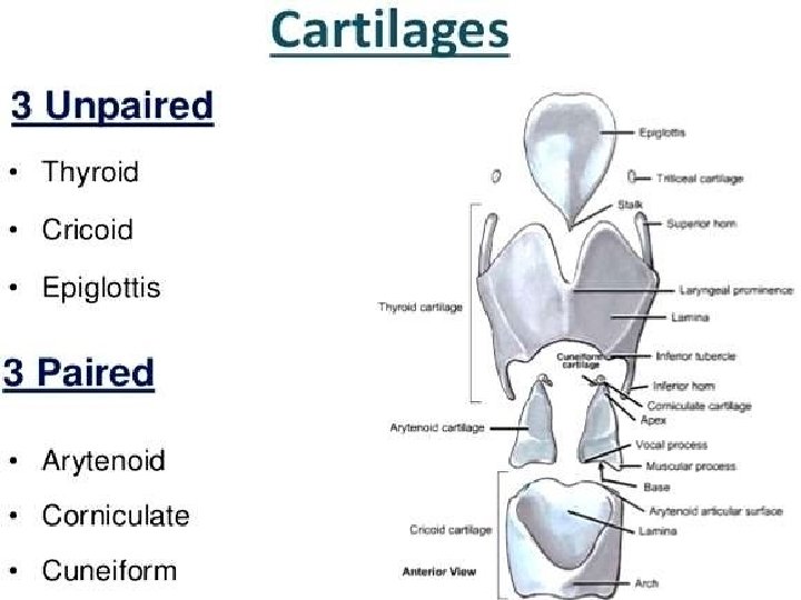 • Complex organ of voice production • Composed of 9 cartilages connected by membranes and ligaments • Contains the vocal folds • Located anteriorly in the neck • Vertebral levels C 3 -C 6 • Connects the inferior part of the Oropharynx to the trachea • Lies anterior to the Laryngopharnx • Secondary function is to guard the air passages