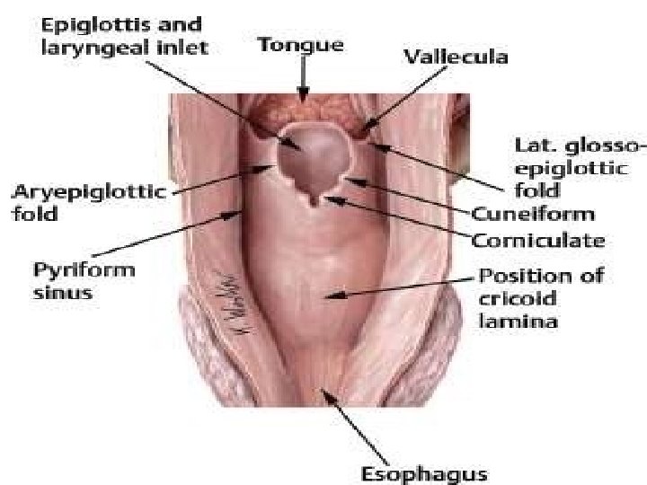 • • • Extends from the superior border of the epiglottis and the pharyngoepiglottic folds to the inferior border of the cricoid cartilage Borders Posteriorly: related to the bodies of the C 4 - C 6 vertebrae. Posterior and lateral walls: Middle and Inferior constrictor muscles