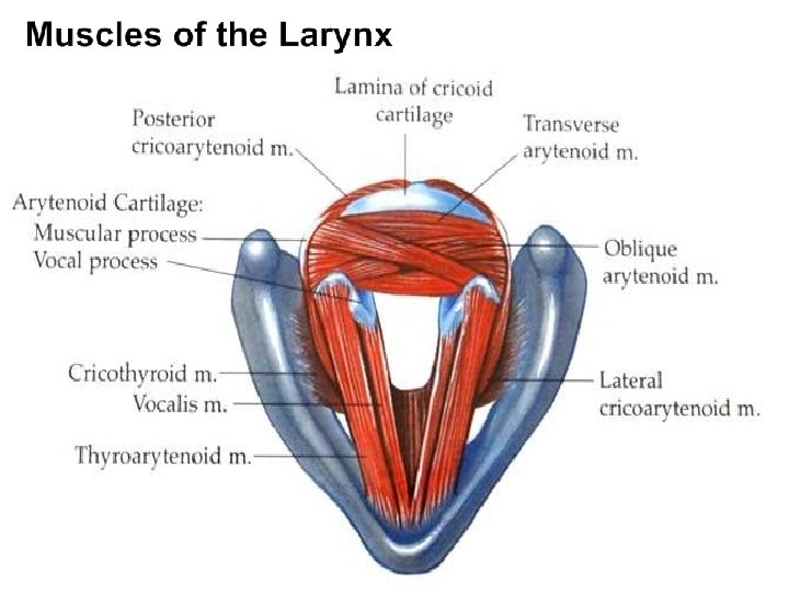 Muscle Origin Insertion Innervation Action Cricothyroid Antero-lateral part of cricoid cartilage Inferior margin and inferior horn of thyroid cartilage External laryngeal nerve Thyro-arytenoid Lower ½ of posterior aspect of angle of thyroid laminae and cricothyroid ligament Anterolateral arytenoid surface Posterior Cricoarytenoid Posterior surface of lamina of cricoid cartilage Stretches and tenses vocal ligament Relaxes valocal ligament Abducts vocal folds Vocal process of arytenoid cartilage Inferior laryngeal nerve (terminal part of recurrent laryngeal nerve from vagus) Adducts vocal folds Lateral cricoarytenoid Arch of arytenoid cartilage Transverse & Oblique arytenoids One arytenoid cartilage Contra-lateral arytenoid cartilage Adducts arytenoid cartilages Vocalis Lateral surface of vocal process of arytenoid cartilages Ipsilateral vocal ligament Relaxes posterior vocal ligament while maintaining tension of anterior part