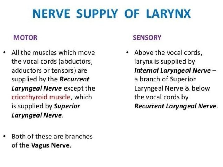 • Superior Laryngeal artery Supplies the internal surface of the larynx • Cricothyroid artery Supplies the cricothyroid muscle • Inferior Laryngeal artery Supplies the mucous membrane and the muscles of the inferior part of the larynx