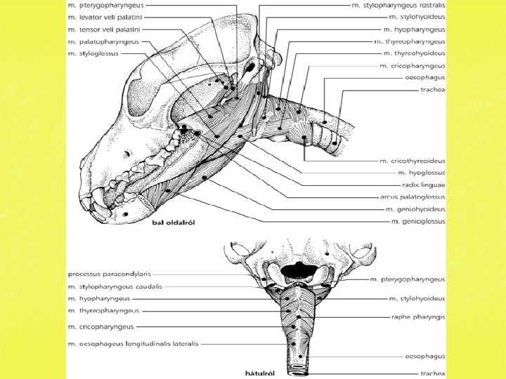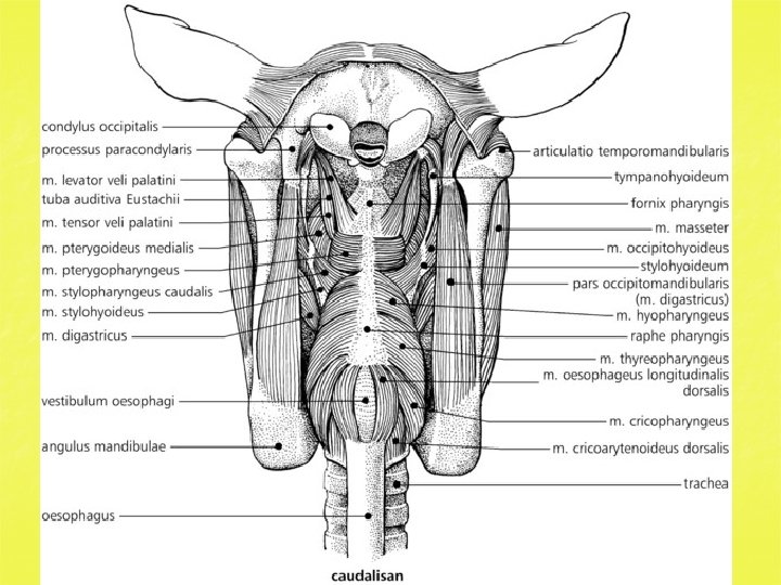Raphe pharyngis Mm. Constrictores pharyngis rostrales M. pterygopharyngeus, m. stylopharyngeus rost. pharynx’i yukarı kaldırır M. Constrictor pharyngis medius M. hyopharyngeus pharyngis’in orta kısmının konstriktoru Mm. Constrictores pharyngis caudales M. thyropharyngeus, m. cricopharyngeus konstriktor – lokmayı esophagus’a gönderir M. Stylopharyngeus caudalis ( dilator )