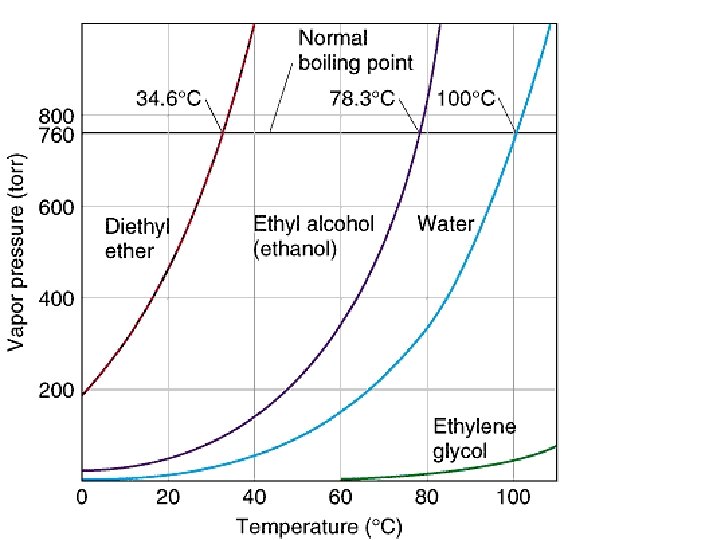 Vapor Pressure increases with temperature • Increasing the average kinetic energy of the molecules, means they require less additional energy to overcome their intermolecular forces to become a gas.