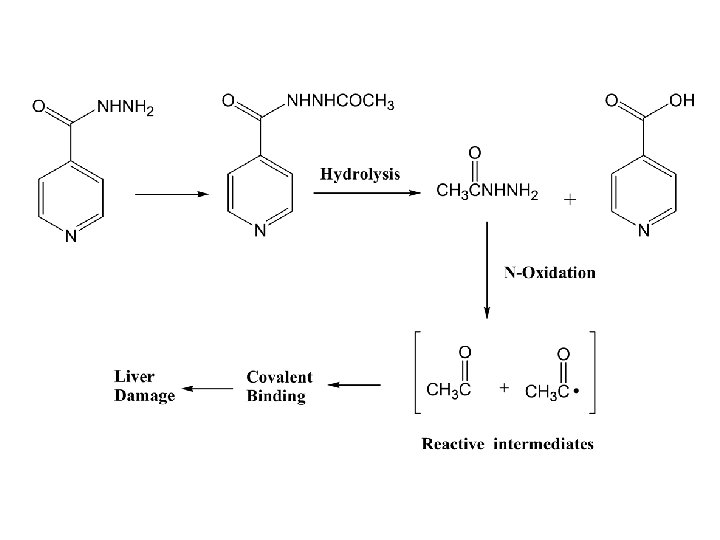 –Acetylation result in decreased water solubility. – Genetic differences exist in some animal species and in humans, where one distinguishes between slow and fast acetylators. – Examples of drugs exhibiting acetylation polymorphism is the antituberculosis drug isoniazid (INH) –The drugs metabolized by acetylation may become ineffective in fast acetylators and cause toxicity in slow acetylators. This liver toxicity may be attributed to the formation of chemically reactive acylating intermediates as shown in the following scheme: