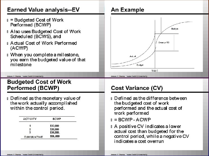 Earned Value analysis--EVA v Earned value = Budgeted Cost of Work Performed (BCWP) v Planned value = Budgeted Cost of Work Scheduled (BCWS), and v Actual Cost = Actual Cost of Work Performed (ACWP) v When you complete an activity, you earn the budgeted value of that activity
