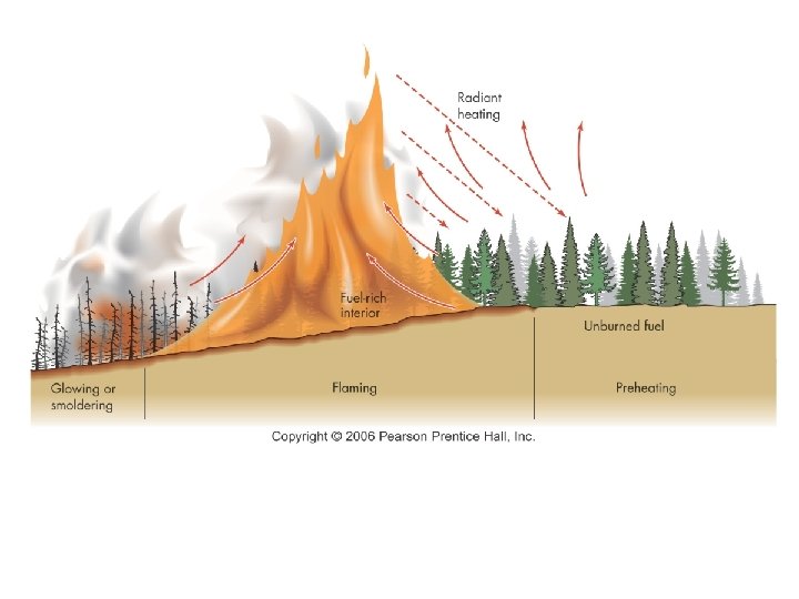 Phases of wildfires • Preignition (energy absorbing) – Preheating – drying out – Pyrolysis – chemical degradation • Combustion (energy liberating) – Fire triangle in place