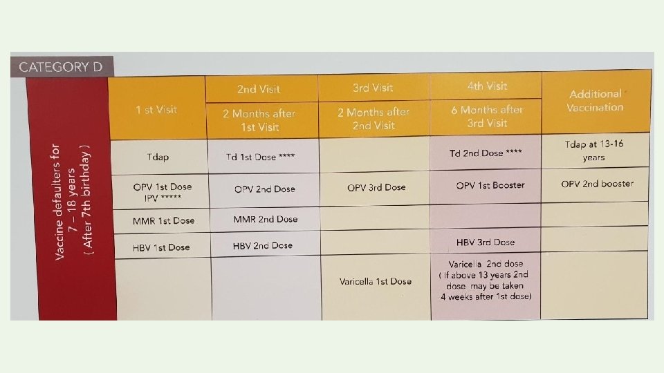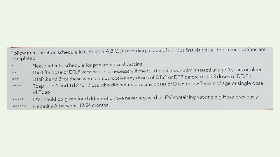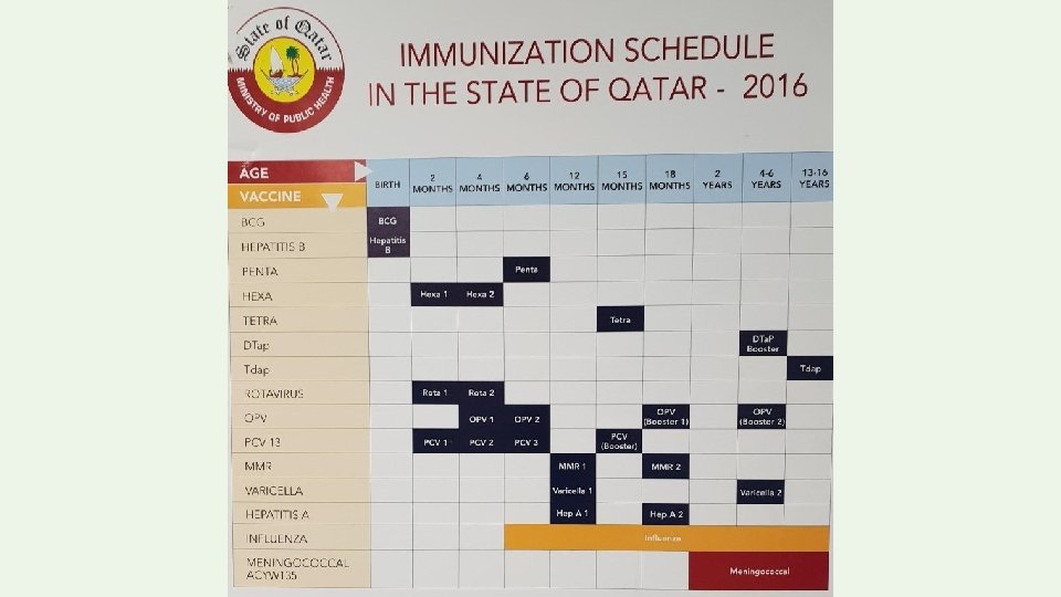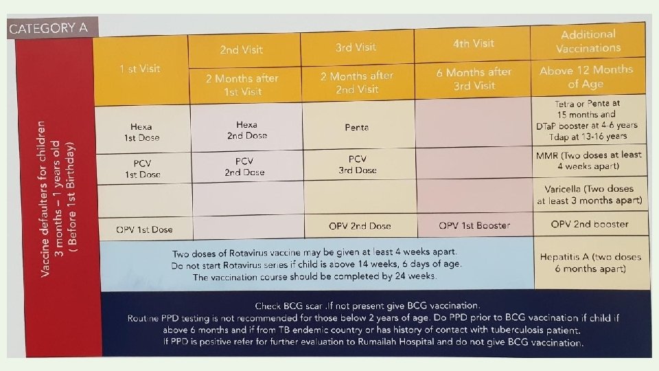 MMR 2 doses VARICELLA 2 doses HEPATITIS B 3 doses HEPATITIS A 2 doses between 12 -24 months and above 24 months for travelers to endemic areas ROTAVIRUS 2 doses before 6 months DTa. P 3 months-4 years: 5 doses 4 years-5 years : 4 doses After 5 th birthday-7 years : 3 doses Tda. P 1 dose above 7 years followed by 2 doses of Td if no doses or incomplete doses of DTa. P were given before 7 years Booster dose at 13 -16 years IPV/OPV 1 -2 doses of IPV, 3 -4 doses of OPV