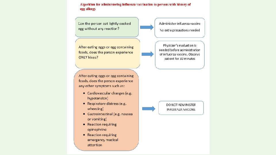 A 6 year old boy with a history of bronchial asthma is coming to receive annual influenza vaccine. He has a history of allergy to eggs ‘”Hives”. How would you approach? What if he had history of anaphylaxis to eggs?
