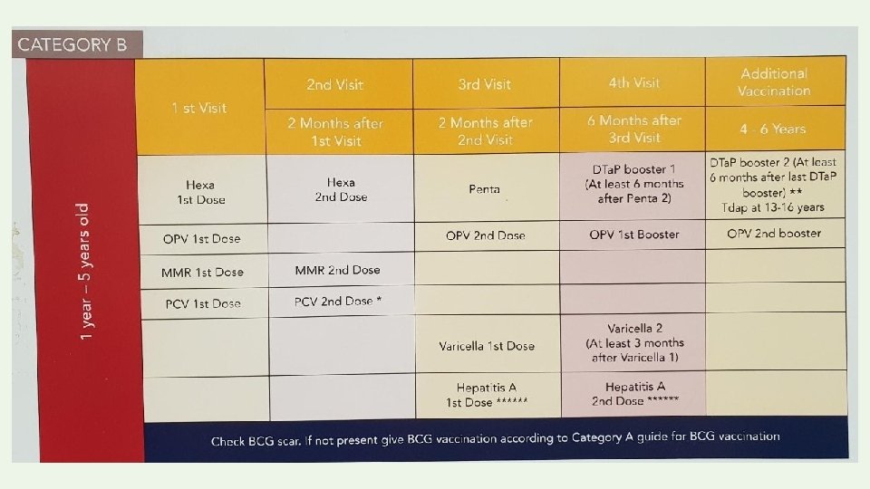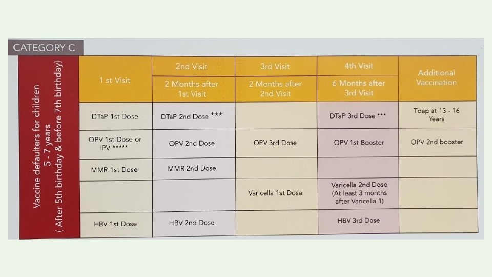 Infants or children from 3 months-18 years of age who : 1. Start vaccination late or have delayed vaccination for more than 1 month according to National Immunization Schedule 2. Have not completed vaccination series of recommended vaccines in National Immunization Schedule 3. Lack reliable evidence of immunity or immunizations