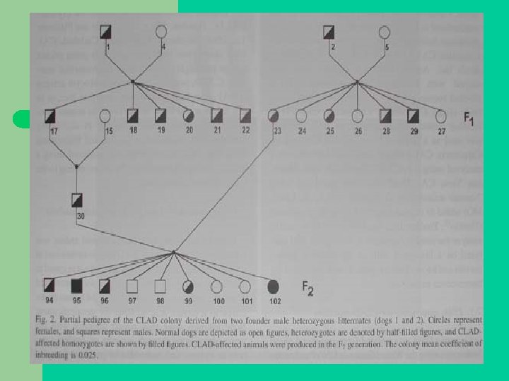 RESULTATS l Pédigrée : mutation récessive autosomale l Signes cliniques : Apparition précoce – Leucocytose – Taille, omphalite, fièvre, HOD (hypertrophic osteodystrophy) – Infection bactérienne sévère – l Prophylaxie : AB large spectre jusqu’à confirmation du statut CLAD. Si chiots atteints : AB mais infections bactériennes fréquentes