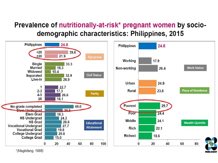Trends in the prevalence of nutritionally at-risk pregnant and lactating women, 1998 -2015 40 30, 7 30 26, 6 20 17, 6 10 28, 4 19, 8 16, 1 25, 0 24, 8 24, 7 21, 7 22, 4 17, 7 13, 6 Pregnant women 0 26, 3 1998 2000 2002 2004 Lactating women 2006 2008 2010 2012 2014 Source. National Nutrition Surveys. Food and Nutrition Research Institute, DOST