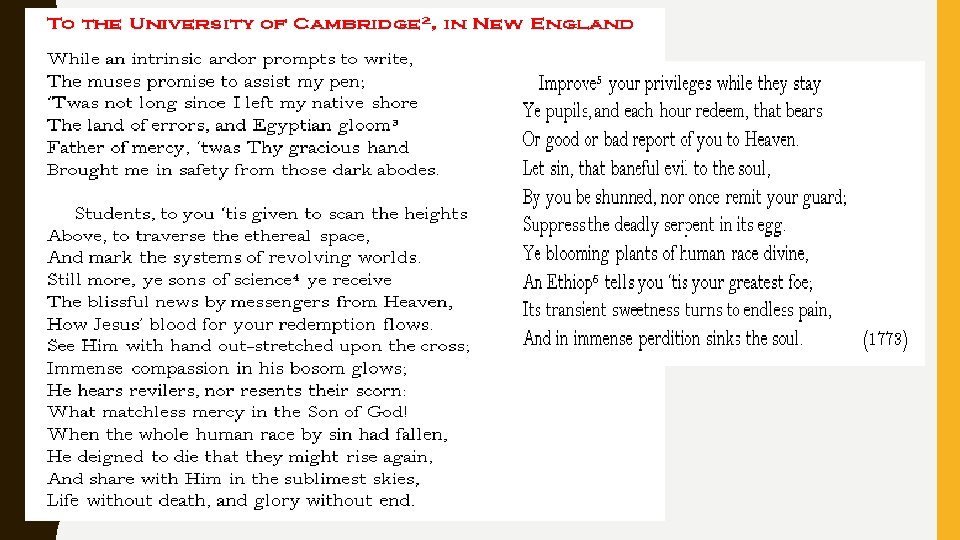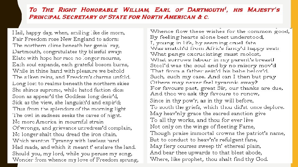 PHILLIS WHEATLEY (1753 -1784) • The first black woman poet of note in the United States. • Born c. 1753, present-day Senegal/Gambia(? ), West Africa, and forcefully brought to Boston in 1761. • Phillis was named after the vessel that brought her to the US, by her masters John and Susannah Wheatley. • Remarkably intelligent from the start, Phillis was taught to read and write. • She also learned Latin and even translated a tale by Ovid. • Literarily, influenced by John Milton, Alexander Pope, and Thomas Gray. • Became famous for her poem on the death of Reverend George Whitefield. • Published her book Poems on Various Subjects, Religious and Moral, in London, in 1773. • Died December 5, 1784, Boston, Massachusetts, U. S. ),