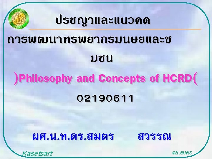 การพฒนา = Development ? Merriam-Webster's Dictionary: Text: progressive advance from a lower or simpler to a higher or more complex form <development of a seed into a plant> <development of an industry< Synonyms : evolution, evolvement, flowering, growth, progression, unfolding, upgrowth Related Word : advance, advancement, ongoing Kasetsart ดร. สมตร