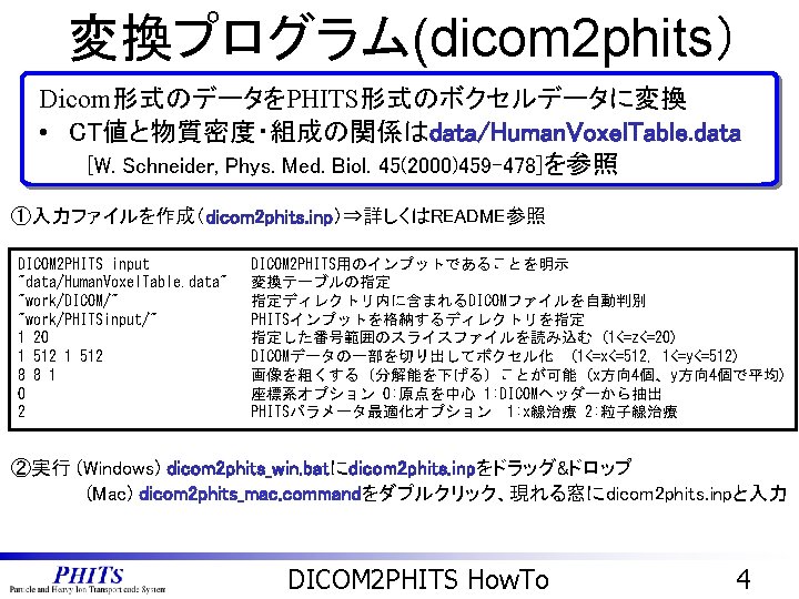 ![CT値⇔物質密度・組成変換表 data/Human. Voxel. Table. data サンプル表 [W. Schneider, Phys. Med. Biol. 45(2000)459を参照] 2行目:分割数 1行目:実行時に画面に表示するコメント Table CT値⇔物質密度・組成変換表 data/Human. Voxel. Table. data サンプル表 [W. Schneider, Phys. Med. Biol. 45(2000)459を参照] 2行目:分割数 1行目:実行時に画面に表示するコメント Table](https://slidetodoc.com/presentation_image_h/e47451dc40a82ca970bd2fd90c93f18e/image-7.jpg)