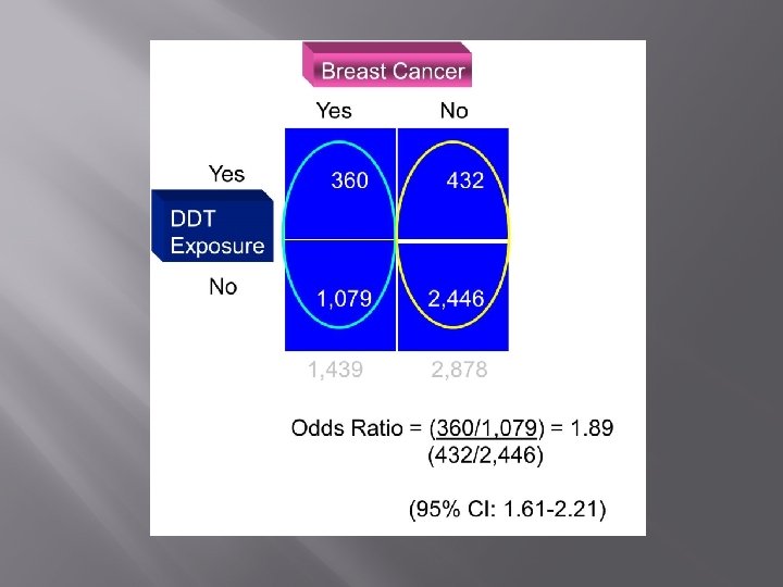 a/b c/d OR = a/b : c/d = ad/bc >1 Chênh lệch ca mắc bệnh giữa 2 nhóm E+ và E- cao hơn Chênh lệch ca ko mắc giữa 2 Nhóm E+ và E-