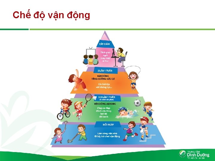 Chế độ vận động Tránh ngồi lâu một chỗ, đọc truyện, chơi game kéo dài. Không chơi game hay xem ti vi quá 2 giờ/ ngày. Khuyến khích tham gia các trò chơi vận động và phụ làm việc nhà thích hợp i t nhâ t 60 phút/ngày. Khuyến khích và tạo điều kiện cho trẻ tham gia ít nhất một môn thể thao. Tạo điều kiện cho trẻ tăng cường đi bộ và đạp xe đê n trươ ng.