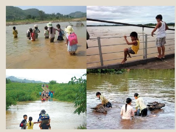 - Các phương tiện giao thông đường thuỷ thô sơ không được chở quá số người quy định. - Khi tham giao thông đường thuỷ , những người tham giao thông ngồi đúng vị trí quy định của mình. (trích : Luật giao thông đường thuỷ) 3 v Chấp hành tốt các quy định về an toàn khi tham gia các phương tiện giao thông đường thuỷ. Tuyệt đối không lội qua suối khi trời mưa lũ, dông bão.