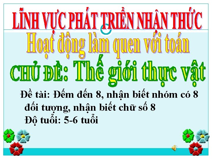 I/ Mục đích yêu cầu: 1. Kiến thức: Trẻ biết đếm đến 8, nhận biết nhóm có số lượng 8, biết chữ số 8 và biết tạo nhóm có số lượng 8 chính xác. 2. Kỷ năng: Luyện kỷ năng đếm thành thạo nhóm có số lượng 8, xếp tương ứng 1 - 1, so sánh, suy luận , xếp khéo léo. - Rèn kỹ năng đếm và xếp từ trái sang phải, ghi nhớ chủ định. 3. Thái độ: giáo dục trẻ biết hợp tác, chia sẻ cùng bạn. Biết chăm sóc, bảo vệ các con vật nuôi.