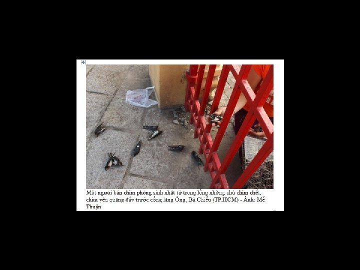 Và thưa quí bạn đây là hình ngôi chùa Phổ Đà Sơn Bài phóng sự tôi vừa đề cập (gồm chữ và hình) ở một số trang tiếp sau đây: TT -Chủ Nhật, 27/12/2009, 09: 02 (GMT+7) Những người thả chim phóng sinh thường chỉ thấy cảnh trước mắt là những chú chim mạnh khỏe tung cánh lao vào bầu trời tự do. Mấy ai để ý số chim chết vì nuôi nhốt chật chội, chết vì yếu nên bị chó tha mèo vồ. Việc thiện đâu chưa thấy, lại thấy tội lỗi bội phần. . . Ngày rằm, lễ tết, ngày giải hạn tuổi cho đến ngày xả xui rủi thất bại trong làm ăn, xả vận đen trong cuộc sống. . . , người ta thường đi chùa mua chim phóng sinh. Và mỗi ngày có biết bao nhiêu chú chim phải nhận lấy cái chết tội nghiệp. Số lượng chim bị chết do không được chăm sóc là bao nhiêu thì chỉ những người bán chim mới biết. Những hình ảnh ghi nhận từ chùa Vĩnh Nghiêm (Q. 3, TP. HCM) và lăng Ông, Bà Chiểu (Q. Bình Thạnh) phần nào giúp độc giả hình dung về số phận của những chú chim bé bỏng và cách hành xử đầy thô bạo của những người bán chim. Nguồn: Tất cả hình ảnh và chú thích ở đây đều là việc thật người thật.
