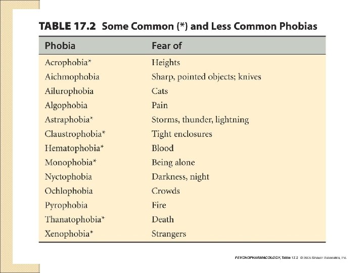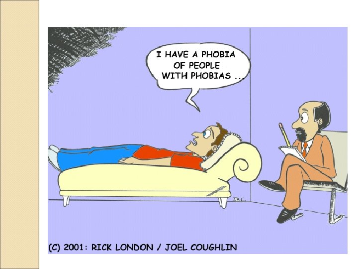 Specific phobias in other cultures Pa-feng and pa-leng Jin-kyofu-sho or taijin-kyofu-sho Ø Improper facial expression (rigid) Ø innapproriate eye contact Ø perspiring profusely Ø trembling hands, voice, feet Ø uncontrolled flatulance