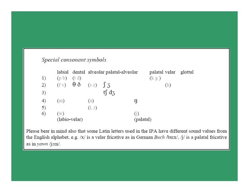 Recommended literature on Phonetics Ashby, Michael and John Maidment 2005. Introducing phonetic science. Cambridge: University Press. Catford, J. C. 2001. A practical introduction to phonetics. 2 nd edition. Oxford: University Press. Clark, John, Colin Yallop and Janet Fletcher 2006. An introduction to phonetics and phonology. Third edition. Oxford: Blackwell. Cruttenden, Alan 2001. Gimson’s Pronunciation of English. 6 th edition. London: Arnold. Crystal, David 2002. A dictionary of linguistics and phonetics. 5 th edition. Oxford: Blackwell. Davenport, Mike and S. J. Hannahs 1998. Introducing phonetics and phonology. London: Arnold. Davis, John F. 2004. Phonetics and phonology. Stuttgart: Klett Verlag. Fry, Dennis B. 1979. The physics of speech. Cambridge: University Press. International Phonetic Assoc. , 1999. Handbook of the International Phonetic Association. Cambridge: University Press. Laver, John and William J. Hardcastle (eds) 1995. Handbook of phonetic sciences. Oxford: Blackwell. Ladefoged, Peter 2000. A course in phonetics. 4 rd edition. New York: Harcourt Brace Jovanovich. Ladefoged, Peter 2000. Vowels and consonants. An introduction to the sounds of languages. Oxford: Basel Blackwell. Wells, John C. 2006. English intonation. An introduction. Cambridge: University Press.