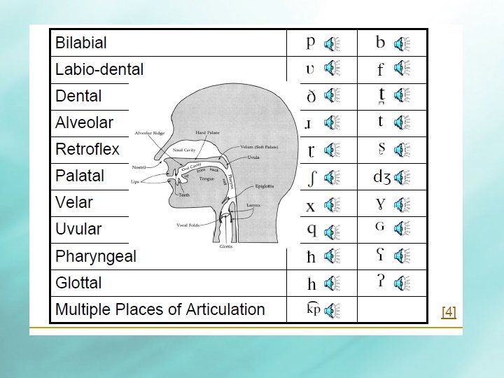 Places of Articulation : Labial: any sound made with closure or near closure of the lips • Bilabial: sounds involving both lips English: peer, bin, month • Labiodental: sounds involving the lower lip and upper teeth English: fire, vow