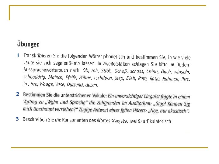 Phonologie (3) n n Kommutation: Probe, in der anhand einer Substitution festgestellt wird, ob ein Laut in einer gegebenen Sprache bedeutungsunterscheidende Funktion hat. Minimalpaar: zwei sprachliche Zeichen mit der gleichen Anzahl von Lauten, die sich in genau einem Laut unterscheiden